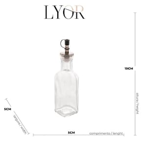Garantia: 90 dias / Peso total: 0,392kg / Cor predominante: transparente / Ref: 7798138644007; Dimensões da garrafa para azeite: 5cm (C) x 5cm (L) x 19cm (A); Dimensões do porta vinagre: 5cm (C) x 5cm (L) x 19cm (A); Capacidade da garrafa para azeite: 200ml; Capacidade do porta vinagre: 200ml; Materiais: vidro, plástico e silicone; Conteúdo: 1 garrafa para azeite e 1 porta vinagre; Cuidados: lavar com detergente neutro, esponja macia e secar imediatamente; não utilizar materiais abrasivos.