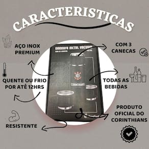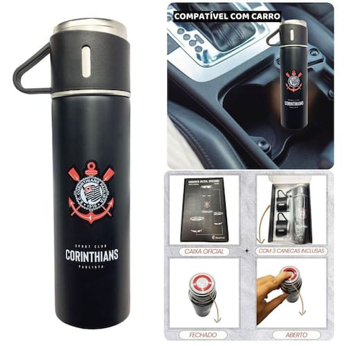 Kit 2 garrafas térmica preta 420ml com 6 canecas g quente frio vácuotime corinhians oficial