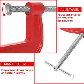 Kit 2 Grampos Sargento 6 Pol. Tipo C em Ferro Reforçado Charbs Grampo Sargento 6 Pol. 150mm Tipo C. Corpo em ferro fundido, Fuso em aço especial. Utilizado em marcenarias para firmar ou prender peças que necessitem ser trabalhadas ou coladas. - Marca: Charbs - Kit com 2 unidades - Abertura: 6 Pol 150mm - Comprimento total: 225mm - Comprimento da garganta: 70mm - Largura: 90mm - Cor: vermelho - Corpo em ferro fundido - Fuso em aço especial - Utilizado principalmente em marcenarias para firmar ou prender peças que necessitem ser trabalhadas ou coladas - Peso bruto: 530 gramas - : 90 dias Marca: Não Informado