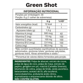 Kit 2 Green Shot Ocean Drop Vegano 180g Sabor Abacaxi O Green Shot é uma forma prática de aumentar o consumo de frutas e vegetais, ajudar na hidratação do corpo e fornecer ingredientes benéficos para a saúde. Ele possui ação antioxidante, melhora a imunidade, auxilia na formação de colágeno e no metabolismo energético, além de complementar a ação desintoxicante de uma dieta saudável. Modo de consumo: - Diluir 1 colher de sobremesa aproximadamente 6g em 100ml de água ou conforme recomendação . - Produto com duração de 1 mês. Composição: - Polpa de abacaxi, extrato de couve, polpa de água de coco, polpa de maçã, extrato de pepino, gengibre em pó, matchá Camellia Sinensis , bitartarato de colina, polpa de limão, ácido ascórbico, betacaroteno, acetato de DL alfa tocoferol, cianocobalamina, coenzima Q10, acidulante ácido cítrico, aromatizante e antiumectante dióxido de silício. - NÃO CONTÉM GLÚTEN. Indicação: - Desintoxicante - Efeito Detox. - Antioxidante. - Metabolismo e Oxidação de Gorduras. Contraindicação: - Este produto é indicado para o grupo populacional maior de 19 anos. - Não deve ser consumido por gestantes, lactantes e crianças. - Este produto não é um . Sabor: Abacaxi. Marca: Não Informado