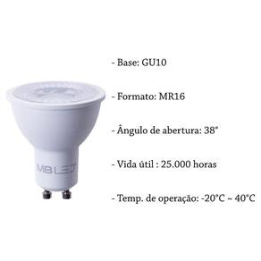 - base: gu10 - formato: mr16 - temperatura de cor: 3000k branco quente - tensão: bivolt - potência: 6w - fator de potência: 0.70 - fluxo luminoso: 417lm - eficiência luminosa: 69,5lm/w - ângulo de abertura: 38 - vida útil : 25.000 horas - temp. De operação: -20c 40c Ean: 7891072777487