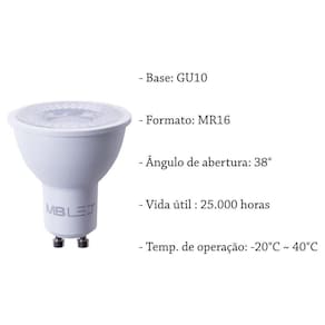 - base: gu10 - formato: mr16 - temperatura de cor: 3000k branco quente - tensão: bivolt - potência: 6w - fator de potência: 0.70 - fluxo luminoso: 417lm - eficiência luminosa: 69,5lm/w - ângulo de abertura: 38 - vida útil : 25.000 horas - temp. De operação: -20c 40c