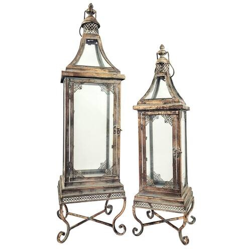 Lanterna P: Altura Aprox.: 57,0 cm / Altura Aprox. Com Alça: 63,0 cm / Largura Aprox.: 16,0 cm / Profundidade Aprox.: 16,0 cm / Peso: 1.730 g Lanterna G: Altura Aprox.: 70,0 cm / Altura Aprox. Com Alça: 77,0 cm / Largura Aprox.: 19,0 cm / Profundidade Aprox.: 19,0 cm / Peso: 2.565 g Material: Metal e Vidro Cor: Cobre Envelhecido Conteúdo da Embalagem: 2 Lanternas Decorativas