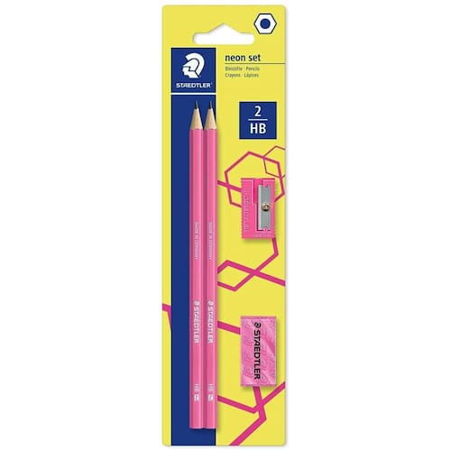- Marca: Staedtler - Linha: Neon set - Cor: Rosa - Tonalidade: Neon - 02 Lápis HB - 01 Apontador - 01 Borracha - Minha suave - Formato hexagonal - Corpo emborrachado - Alta resistência à quebra - Superfície macia e ergonômica - Conteúdo de madeira de florestas alemãs - Medidas da embalagem: 235 x 66 x 15 cm - Referência: 180FSBK2P1 Ean: 4007817613146