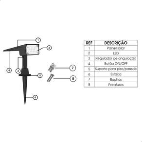 Características do produto: - tecnologia solar eficiente: equipado com um painel solar cristalino de 0,6w, que converte a luz do sol em energia elétrica, recarregando a bateria interna durante o dia. - instalação simples e rápida: posicione o spot em um local que receba bastante luz solar. Um sensor fotossensível acende automaticamente a luminária ao anoitecer. - resistente e durável: fabricado em plástico de alta resistência abs , é ideal para áreas externas, sendo resistente à água. - painel solar articulado: permite melhor direcionamento para o sol, otimizando o carregamento da bateria. - foco de luz direcionável: ideal para destacar elementos específicos no jardim, com duas opções de aplicação: no piso/solo ou na parede. - escolha a cor da luz: personalize a iluminação do seu jardim com leds que oferecem opções de luz vermelha, verde, azul ou ciclo rgb.