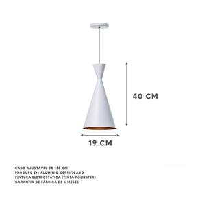 - dimensões: 40x19cm - canopla redonda de 11cm de diâmetro - produto feito em alumínio - 150cm de fio ajustável - pronto para instalação - utilize a lâmpada que desejar