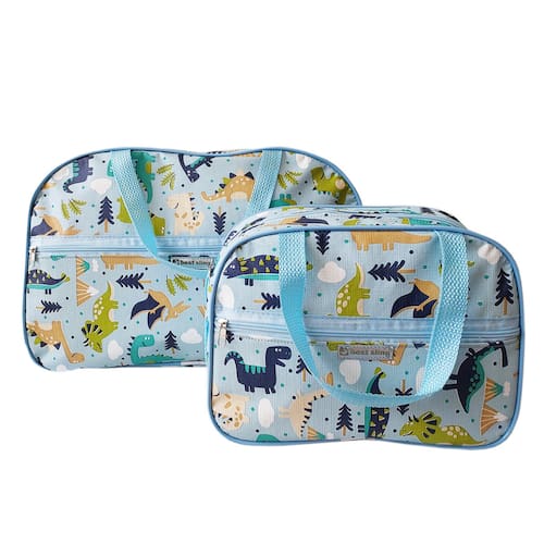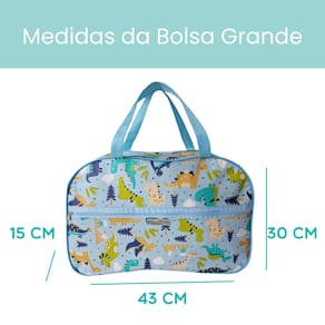 Kit Bolsa Maternidade: Uma aventura pré-histórica para o seu pequeno explorador! Este kit incrível com duas bolsas, estampadas com dinossauros divertidos e vibrantes, é perfeito para acompanhar mamãe e bebê em todas as expedições da maternidade.