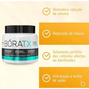 Mascara Boratx proporciona aos cabelos a verdadeiro condicionamento, auxilia na redução do frizz, hidratação, maciez dos fios, e promovendo a melhoria e suavização das cutículas danificadas, resultando em um brilho intenso e resultado verdadeiramente de salão. Contém ativos modernos formado por óleos vegetais leves, proteínas de baixo peso molecular e 19 aminoácidos que promovem maciez e suavidade.