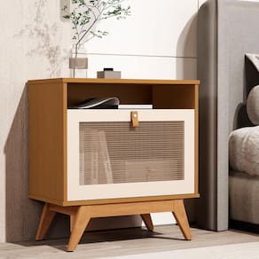 Com porta em ratam, pés em madeira maciça e acabamento de alta qualidade em MDF, ela é perfeita para organizar com estilo.