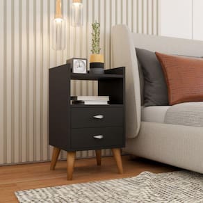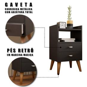 Com pés em madeira maciça estilo retrô, esta Mesa de Cabeceira é perfeita para as laterais da sua cama. Possui duas gavetas com amplo espaço interno e puxadores cromados.