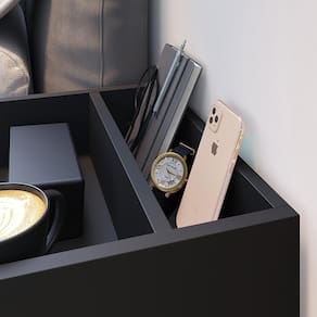 Ela conta com uma divisória em seu tampo superior, perfeita para acomodar itens pequenos e de uso diário, como: celular, bloco de anotações, despertador, entre outros.