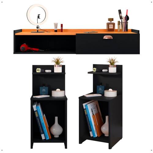 Apresentamos o conjunto Mesa de Cabeceira Fantasy + Penteadeira Suspensa Decor: elegância e organização em um só lugar.