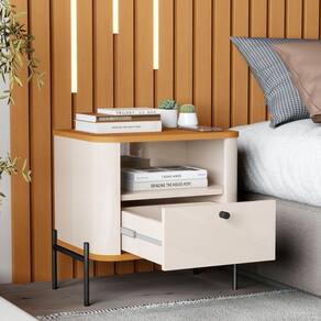 Conta com 1 gaveta com corrediças telescópicas e puxador em metal, oferecendo espaço eficiente para seus objetos essenciais.