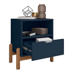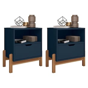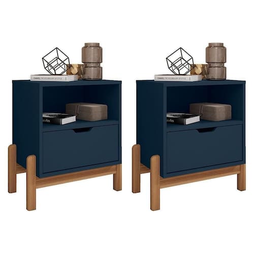 Kit 2 Mesas De Cabeceira Antares 1 Gaveta Azul Cobalto - Casa D Azul Cobalto Kit 2 Mesas de Cabeceira Antares 1 Gaveta - Casa D Descubra a Mesa de Cabeceira Antares que combina elegância e funcionalidade. Com estrutura em MDP e pintura UV, oferece durabilidade e um acabamento impecável. A gaveta com corrediças telescópicas proporciona deslizamento suave e a frente usinada adiciona sofisticação. O nicho é ideal para livros ou objetos decorativos, enquanto os pés de madeira maciça garantem robustez e charme. Perfeita para qualquer decoração, essa mesa é a escolha ideal para aliar modernidade e praticidade. ESPECIFICAÇÕES: - Estrutura em MDP - Pintura UV - 1 Gaveta - Corrediças telescópicas - Frente de gaveta usinada - 1 Nicho - Pés de madeira maciça