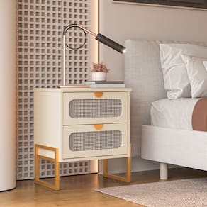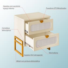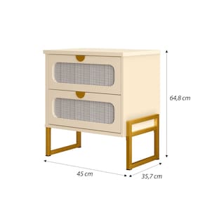 Tipo: Mesa de Cabeceira Modelo: Titanium Cor: Off White Cor da Base: Dourado Estrutura: MDP com acabamento em pintura UV Pés: Metal com pintura eletrostática Possui 2 gavetas: Corrediças metálicas Frentes decorativas em padrão rattan Puxadores embutidos Design: Moderno, funcional e elegante Garantia: 3 meses contra defeitos de fabricação
