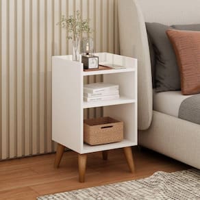 Com pés em madeira maciça estilo retrô, esta Mesa de Cabeceira é perfeita para as laterais da sua cama. Possui duas prateleiras tipo nicho com amplo espaço interno e uma prateleira superior com proteções anti-queda nas laterais.