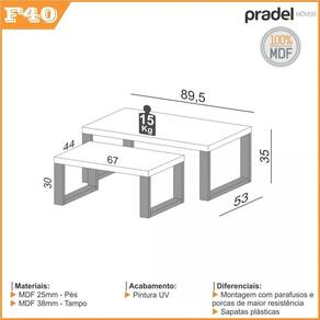 A Pradel traz o Conjunto de mesas de centro industrial F40 JPF na cor Freijó com Preto fosco. Com um design moderno e elegante, o móvel torna-se um complemento para a decoração da sua sala de estar, sala de jantar ou para seu quarto. O conjunto de mesas F40 tem estrutura 100% MDF, com um excelente acabamento proporcionando uma maior durabilidade ao móvel. Produto Montado: Sim Ambiente Principal: Sala de Estar codigo_ean: 7908506257054 Complexidade da Montagem: Baixa: pode ser montado por uma pessoa sozinha Cor: Freijó/Preto Cor do Produto: Freijó/Preto Escala de Brilho: Fosco Itens Inclusos: 2 Mesas, Kit Ferragens e Manual de Montagem Manual de Montagem e Instalação: https://product-hub-prd.madeiramadeira.com.br/694371/documents/0f4b7bad-fcab-47b7-a51d-0c2378642a7a827992f12.pdf Material do Tampo: MDF Material Principal: MDF Necessita Montagem: Sim Origem do Produto: Nacional Peso: 17,2 kg Possui Gavetas: Não Possui Portas: Não Recomendações de Uso, Manutenção e Limpeza: Utilizar somente um pano levemente umedecido e em seguida passe um pano seco. Produtos químicos ou abrasivos podem acabar danificando o acabamento do móvel. Sistema de Montagem: Cavilhas e minifix Suporta Até (kg): 15 kg
