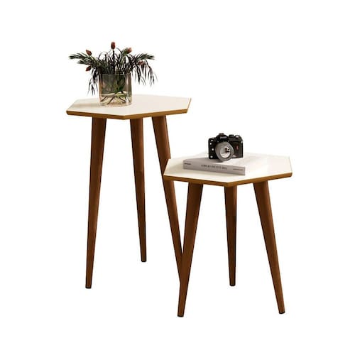 Kit 2 mesas lateral e apoio sala retrô pés palito decor cor off white com freijó - comprar móveis em casa Jogo de 2 mesas lateral e apoio, é vendido pela comprar móveis em casa, oferece um ambiente sofisticado de alta qualidade e acabamento para sua sala. Dimensões do produto montado: Mesa lateral: Altura: 47 cm Largura: 43 cm Profundidade diagonal: 49 cm Mesa apoio: Altura: 62 cm Largura: 43 cm Profundidade diagonal: 49 cm Observações: - estilo retro - tampo sextavado - produzida em mdf de 15mm; - pé de madeira maciça Pintura: Produto com pintura ultravioleta, maior resistência e durabilidade, além de proporcionar um acabamento perfeito para o produto. Instruções de uso e manutenção: Limpar apenas com pano levemente umedecido com água Montagem: Este produto acompanha manual de instrução detalhando passo a passo de como montar. A montagem do produto é de fácil entendimento, mas não deixamos de ressaltar que a mesma deverá ser feita por um profissional, para que não ocorram danos no produto. Atenção: a montagem não é oferecida pela comprar moveis em casa, a montagem do produto é por conta do comprador. Fotos meramente ilustrativas não acompanham os produtos de decoração. Observações importantes: O produto é lacrado e novo com embalagem . A é de 60 dias por defeitos de fabricação. Em caso de erro de montagem, uso inadequado do produto, ou outros acidentes do gênero esta não será acionada. Se por eventuais circunstâncias o produto apresentar defeitos de fabricação, o cliente deverá imediatamente entrar em contanto conosco com o manual de montagens em mãos e com o numero da peça que venha estar que sofreu danos. A comprar moveis em casa ira imediatamente providenciar uma nova peça o mais rápido possível. Se no ato de recebimento do produto o cliente verificar que o produto não está em prefeito estado, principalmente por ocasião de transporte irregular, o cliente deverá recusar o recebimento do produto e entrar em contato para resolver o problema. Todo produto estará acompanhado de um manual de instrução para a montagem do produto. As imagens são meramente ilustrativas Os produtos não são acompanhados de produtos de decoração vasos, revistas, etc. . Marca: Não Informado