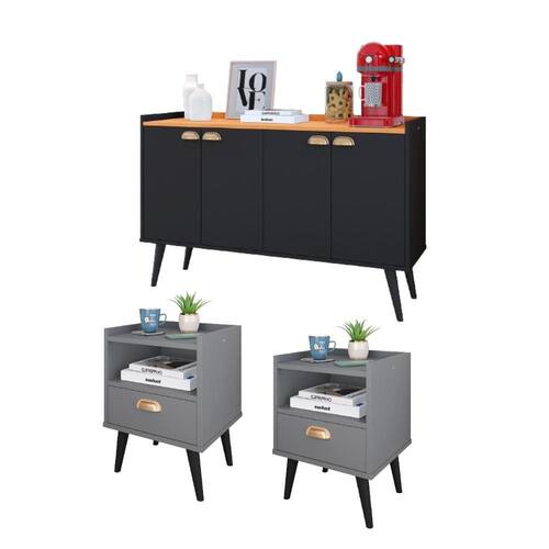 Kit 2 Mesinhas Cabeceira Estilo Retrô Cinza 1 Gaveta Nicho Decorativo e Buffet Kiev Cantinho Café Preto/Cinamomo - RPM Móveis