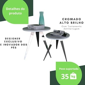 2 Mesinhas Lateral De Canto Para Sala e Quarto Redonda C.B A Mesinha de Canto Evidence é ideal para compor salas e quartos, pois seu projeto utilizam madeira e aço, o que a torna atemporal com muita versatilidade na hora de combinar cores e outros elementos para os mais diferentes estilos decorativos. Querendo uma Mesinha de Canto Exclusiva e diferente do que há no mercado para você arrasar na decoração O grande charme são os traços de seus pés com estilo retrô, fabricados em aço resistente e durável, já que recebem um lindo acabamento cromado dando um Alto Brilho, para evidenciar o tampo de madeira. Mesinha de Canto é super versátil podendo ser utilizada para colocar copos e xícaras, apoiar controles remotos, descansar livros e óculos, deixar o celular carregando, expor as bebidas, apoiar a luminária ou o abajur e entre outros. BENEFÍCIOSAcabamento PremiumResistenteQualidade garantida com Corte a Laser do AçoCromado com tratamento anti-ferrugemBatoque Emborrachado nos pés para não riscar o piso ou escorregarDesigner Exclusivo e Inovador dos Pés ESPECIFICAÇÕES TÉCNICAPeso Suportado: 35KgMaterial dos pés: AçoMaterial do Tampo: Madeira MDP 15mmAcabamento da Estrutura dos pés: CromadoCor dos pés: Alto BrilhoCor do Tampo: BrancoRequer Montagem: SimNível de Dificuldade de montagem: FácilConteúdo da Embalagem: 2 Mesas de Canto MEDIDAS:Diâmetro do Tampo: 45CmAltura dos pés: 50CmAltura Total: 51.8cm Diâmetro do Tampo: 45CmAltura dos pés: 40CmAltura Total: 41.8cm