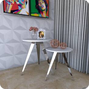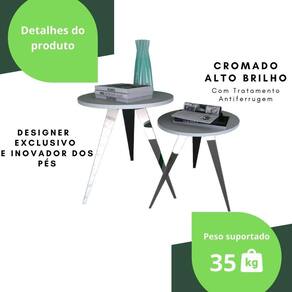 ESPECIFICAÇÕES TÉCNICA Peso Suportado: 35Kg Material dos pés: Aço Material do Tampo: Madeira MDP 15mm Acabamento da Estrutura dos pés: Cromado Cor dos pés: Alto Brilho Cor do Tampo: Branco Requer Montagem: Sim Nível de Dificuldade de montagem: Fácil Conteúdo da Embalagem: 2 Mesas de Canto