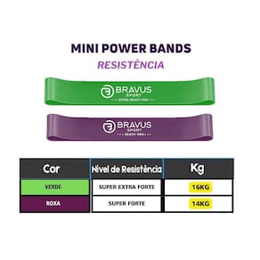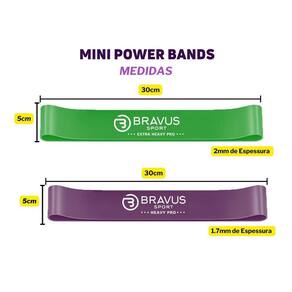 As mini power bands do kit possuem diferentes níveis de tensão progressiva, sendo uma Heavy Pro roxas e uma Extra Heavy Pro verde . A Heavy Pro possui uma espessura de 1.7cm, enquanto a Extra Heavy Pro possui 2cm de espessura.