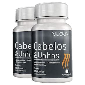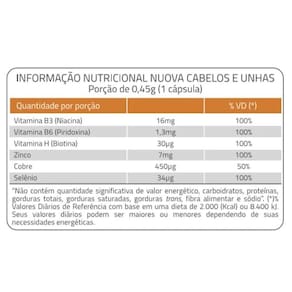 Nuova é um nutri cosmético que contribui para a manutenção do cabelo, da pele e das unhas, além de auxiliar no realce da pigmentação do fios. 1 cápsula por dia. Ingredientes: nicotinamida, óxido de zinco, cloridrato de piridoxina, sulfato de cobre anidro, selenito de sódio e biotina. Veículo: celulose microcristalina ins 460i e colágeno hidrolisado. lubrificante: estearato de magnésio vegetal ins 470iii . Antiumectante: dióxido de silício ins 551 . Gelificante: gelatina ins 428 . corantes: dióxido de titânio ins 171 , quinoleína ins 104 e amarelo crepúsculo ins 110 . Acidulante: ácido acético ins 260 . Não contém glúten. Marca: Não Informado Ean: 7898713096310