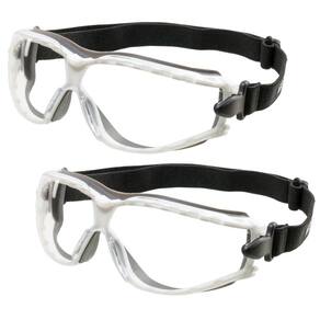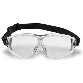 Óculos de proteção, modelo ampla-visão, constituído de armação confeccionada em uma única peça de plástico rígido na cor branca recoberta internamente com borracha, termoplástica macia cinza, sistema de ventilação indireta composto de dezoito fendas, sendo dez na parte superior e oito na parte inferior da armação, ajuste através de tirante elástico preto.