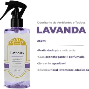 Kit 2 Odorizante De Ambientes E Tecidos 260ml Coala Lavanda Aroma: Lavanda Kit 2 Odorizante Coala Lavanda 260ml. Aromatize ambientes e tecidos com praticidade. Fragrância suave, fresca e duradoura. Renove o ar da sua casa com praticidade e sofisticação. O Odorizante de Ambientes e Tecidos Coala Lavanda oferece uma experiência olfativa leve e agradável, perfeita para o dia a dia. Com jato suave e aplicação rápida, este odorizante foi desenvolvido especialmente para perfumar ambientes e tecidos com eficiência, deixando uma fragrância suave que transmite conforto e bem-estar. Ideal para quem deseja praticidade e eficácia na hora de manter o lar com cheiro de limpeza e frescor. Benefícios do Odorizante Coala Lavanda: Fragrância delicada, fresca e duradoura Pode ser aplicado em ambientes e tecidos Pronto para uso com spray de fácil aplicação Aroma de Lavanda, leve e sofisticado Embalagem prática com 260ml Não mancha tecidos quando corretamente Ideal para uso diário Indicado para uso em: Quartos e salas Banheiros e lavabos Cortinas, sofás, tapetes Roupas e roupas de cama Escritórios e carros Modo de Usar: Agite antes de usar. Posicione o frasco na vertical e pressione o spray para cima. Aplique de 2 a 4 pulverizações no ambiente ou sobre o tecido desejado. Deixe o aroma se espalhar naturalmente. Evite aplicação direta em tecidos delicados ou de cores muito claras sem teste prévio. Informações Técnicas: Produto: Odorizante de Ambientes e Tecidos Fragrância: Lavanda Volume: 260ml Marca: Coala Essências Aromáticas Embalagem: Spray com válvula Finalidade: Aromatizador de uso geral Categoria: Limpeza e perfumação Pode ser em tecidos Sim, é indicado para tecidos. Recomendamos testar em uma pequena área antes. É um aromatizador spray ou contínuo É spray com aplicação por pulverização manual. A fragrância é forte Não. É suave, ideal para quem busca um aroma agradável e não invasivo. Pode usar em carro Sim. É seguro para uso em estofados automotivos e no interior do carro.