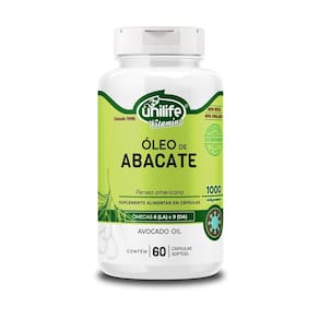Óleo de abacate 60 cápsulas 1200mg - unilife O óleo de abacate unilife é um suplemento em cápsulas à base de óleo de abacate, que por sua vez é rico em gorduras do bem, como o ácido oleico ômega 9 , luteína, vitaminas e minerais. Além disso, é enriquecido com 4 vitaminas lipossolúveis a, d, e, k , que melhoram a absorção do produto. Benefícios do óleo de abacate: Contém ingredientes naturais; Oferece 100% da recomendação de ingestão diária de vitamina e em apenas uma porção; Oferece 50% da recomendação de ingestão diária das vitaminas a, d e k em apenas uma porção; Fácil e prático para o consumo; Modo de usar: Sugere-se a ingestão de 2 a 4 cápsulas ao dia, após a principal refeição. Ingerir com líquido. Ingredientes: Óleo de abacate, gelatina e umectante glicerina. Marca: Não Informado Ean: 7908609508121