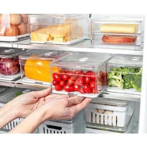 Kit 2 Organizadores De Geladeira 2,2l E Porta Frios Duplo Ou Cor: Transparente Kit 2 Organizadores De Geladeira 2,2L + Porta Frios Duplo Organizadores Clear Fresh OU. Conteúdo: - 01 Organizador com bandeja de drenagem; - 01 Organizador com cesto de drenagem; - 01 Porta frios duplo. Dimensões dos organizadores: 20cm C x 15cm L x 9,5cm A Capacidade dos organizadores: 2,2 Litros. Dimensões do porta frios: 20cm C x 15cm L x 8cm A Organize Frutas, Verduras, Legumes e Hortaliças. Organizadores de geladeira transparentes Porta frios modular e empilhável Linha Clear Fresh OU Ventilação e Humidade controlada Organização e otimização de espaço Com Cesto Removível Drenagem Com o organizador de geladeira Clear Fresh, você terá organização e irá conservar e manter o frescor de seus alimentos por mais tempo, a tampa com ventilação ajustável mantém o nível de umidade ideal para cada tipo de alimento, mantendo-os frescos por mais tempo. Possui cesto que auxilia na lavagem e impede que a umidade acumulada se mantenha no alimento, evitando o murchamento e deterioração. Detalhes dos produtos: - Os organizadores possuem cesto e bandeja de drenagem que evitam que os alimentos fiquem molhados após a lavagem, ajudando a prevenir a deterioração precoce; - As tampas com respiradouros dos organizadores mantém o nível de umidade ideal para cada tipo de alimento, mantendo-os frescos por mais tempo; - O cesto de drenagem dispõe de alças laterais que facilitam o transporte e manuseio; - Possuem total transparência para você enxergar o conteúdo e manter tudo em ordem; - Não suportam micro-ondas; - Livres de bisphenol A; - Não suportam freezer; - Suportam geladeira; - Empilháveis. Materiais: - Polipropileno PP ; - Poliestireno PS .