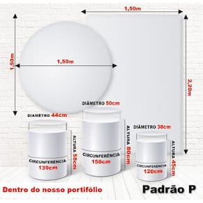 Especificações do produto:Os painéis são produzidos com qualidade fotográfica em impressão sublimática digital de última tecnologia.Estamos sempre atentos às novidades e tendência do mercado.O material utilizado é tecido malha flexível poliéster com elástano 240g/ml de ótimo caimento e não reflete luz.O melhor disso tudo não amassa. Isso é o sonho de todo decorador.Possui costura overlock nas laterais para não desfiar e elástico no redondo.Pode ser molhado ou lavado com água e sabão neutro, evite ser exposto ao sol pois secam rapidamente.As cores dos produtos podem variar de tonalidade em 15% devido resolução do monitor ou tela do celular, mas nada que interfira na qualidade e beleza do mesmo.Garantia contra defeito de fabricação.Sobre efeitos 3d, 4k, 8k e glitter:São efeitos que não podem serem visto à olho nu, somente por trás de lentes de câmeras.Vou dar um exemplo quando vamos no cinema e tiramos o óculos fica turvo e aparentemente tremidas as imagens e assim são o mesmo com as imagens impressas.Façam o teste se não conhecerem dos efeitos e verão o quanto ficam lindas e maravilhosas e encante seu público alvo.Painel redondo: Painel redondo 1,50m de diâmetro Não acompanha estruturaCapas de cilindro: Não acompanha cilindros de mdf Medidas padrão p do anúncio Cilindro grande: altura: 80 cm x diâmetro: 50 cm x circunferência: 157 cm Cilindro médio: altura: 58 cm x diâmetro: 44 cm x circunferência: 141 cm Cilindro pequeno: altura: 45 cm x diâmetro: 38 cm x circunferência: 119 cmPainel retangular: Painel vertical com passa varão 1,50 largura x 2,20 altura . Não acompanha estrutura.Atenção clientes: Não fazemos alterações em imagens e em medidas do painel e dos cilindros tem que ser como o padrão do anúncio. Não aceitamos artes prontas e inclusão de nomes. Marca: Felicitá