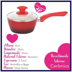 - Espessura: 3,7 mm - Material: Alumínio com revestimento cerâmico - Marca: Class Home - Cor: Vermelho - Conteúdo: 2 Panelas