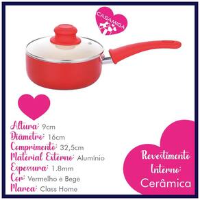 - Espessura: 1.8mm - Material: Alumínio com revestimento cerâmico - Marca: Class Home - Cor: Vermelho - Conteúdo: 2 Panelas
