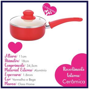 - Espessura: 1.8mm - Material: Alumínio com revestimento cerâmico - Marca: Class Home - Cor: Vermelho - Conteúdo: 2 Panelas