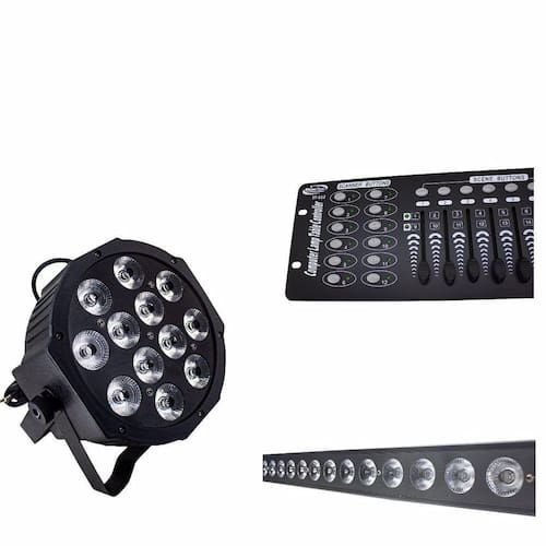 Par led slim rgbw 12 leds de 12w: Um espetáculo de cores Seus parâmetros nunca mais serão os mesmos. Com tecnologia quadri-led, chegou para provar que as cores sempre podem ser mais realistas: ele tem qualidade 3 vezes superior a um modelo padrão. Características - 7 canais dmx - 12 lentes com 1 led cre de 12w 4in1 - tecnologia quadried rgbw 1 led faz as 4 cores - mistura de cores e efeito strobo - display digital - ângulo de abertura 45º - sensor de áudio - funciona com ou sem mesa dmx - modo automático ou sensor de som - cooler para refrigeração - consumo 160w - fonte de alimentação bi-volt - dimensões 19 x 19 x 17 cm - peso 1,4kg Ribalta com 24 leds 3w rgb briwax Uma excelente opção para sua festa ou evento, você não pode deixar de adquirir a ribalta de led 24x3w, sendo elas a cor vermelha, verde, azul e variações tendo uma ampla variedade muito maior de cores e efeitos no mesmo produto. Marca: briwax Canais dmx: 5/8/14/26/50 Voltagem: 110/220v ~ 50/60hz Quantidade led's: 24 ultra brilho rgb Modos de operação: 1- cor estática 2- mudança de cores 3- fade 4- auto run 5- som ativo 6- master slave 7- dmx Dimensões: 1,05m x 6cm x 6cm Peso: 2,5 kg Itens inclusos 1- ribalta 24x3w 1- cabo de energia 1- suporte . 1-manual de instruções Mesa de iluminação onelight dmx 512 Mesa dmx para controlar equipamentos de iluminção com capacidade de armazenar 240 cenas e com ela é possível controlar até 12 aparelhos sendo que para cada aparelho até 16 canais. Compatível com diversos equipamentos. Informações técnicas: 192 canais dmx controla até 12 aparelhos com 16 canais cada simultaneamente Memória para 30 programas com 8 cenas cada 240 cenas no total Controla aparelhos com até 16 canais dmx É possível gravar 8 cenas diferentes na configuração Função blackout Funciona em 110 e 220v Cor: preta Embalagem: 1 x mesa dmx 512 1 x fonte de alimentação bivolt Peso e dimensão: - dimensão: 48 x 13 x 7 - peso: 2,5 kg Ean: 5236014879560