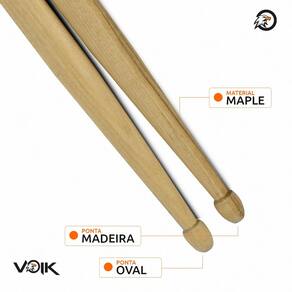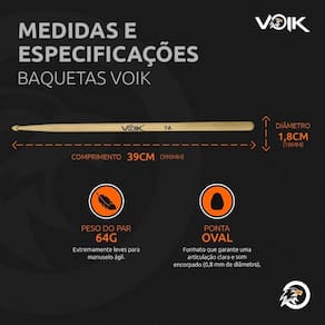 Especificações • Marca: Voik • Modelo: 5A • Madeira: Maple • Formato da Ponta: Oval • Diâmetro da baqueta: 1,8 mm • Diâmetro da ponta da baqueta: 0,8 mm • Comprimento: 40 cm • Peso do par: 68 g