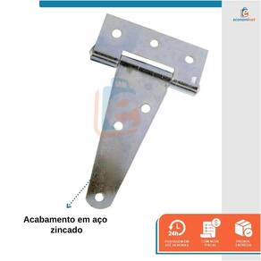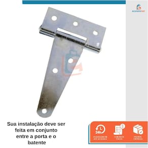 A Dobradiça Leme é ideal para portões de madeiras em geral. Possui acabamento em aço zincado, proporcionando maior resistência à oxidação e corrosão.- Tipo leve, polido e pino solto;- Dobradiças de canto para portas e janelas de madeira mista (portas oca);- Acabamento zincado.Características técnicas:Material: Aço zincadoEspessura da chapa: 2mm ou 0,2cmCorpo da dobradiça: 150mm ou 15cm (6 Polegadas)Comprimento total: 195mm ou 19,5cm)Cor: ZincadoCapacidade máxima por par de dobradiça: 150kgUso indicado: Portas e JanelasMarca: StarferQuantidade: 2 pares (4 unidades)Ref.: 4017617