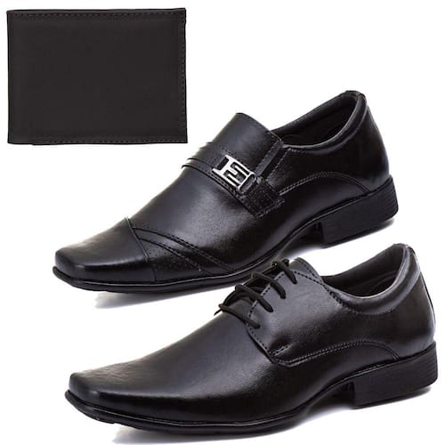 CARACTERÍSTICAS DO PRODUTO Material: Alternativo Material Interno: Tecido Poliéster e Algodão Palmilha: EVA 3mm Solado: Borracha Costurado Altura do Salto (cm): 3 cm Detalhes: O kit é composto por 02 pares de sapato social e 01 carteira