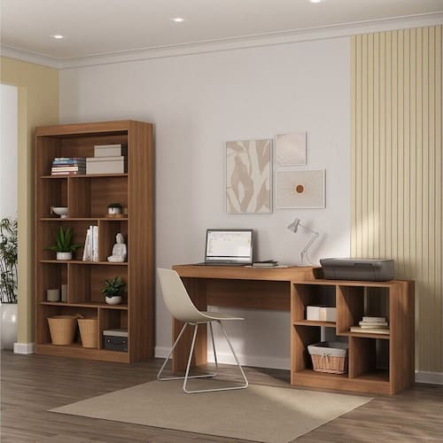 Otimize seu espaço com o Kit 2 Peças com Escrivaninha e Estante para Livros Manila. A Escrivaninha Multifuncional de 160 cm conta com 4 nichos, acabamento em BP e estrutura em MDP, oferecendo funcionalidade e um design moderno. A estante de 181 cm possui 4 prateleiras, cada uma suportando até 4 kg, ideal para organizar livros e objetos decorativos. Ambas as peças têm montagem fácil e garantida por 3 meses, trazendo praticidade e estilo ao seu home office. Acabamento: Pintura UV Altura do Conjunto: 181 cm Ambiente: Escritório Ambiente Principal: Escritório Cor: Nogal Informação Complementar: 1x Estante para Livros 4 Prateleiras 181cmx93cm Home Office Avelã TX/Avelã TX Largura: 93 cm Altura: 181 cm Peso: 35 kg Profundidade: 30 cm Necessita Montagem: Sim