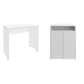 A Escrivaninha Minimalista Mary e o Balcão Multiuso Cool, este kit é ideal para quem busca otimizar ambientes sem abrir mão do design moderno. A Escrivaninha Mary, com seu design clean, é compacta e prática, perfeita para áreas menores, e oferece uma superfície ampla para suas atividades diárias. Seu acabamento de alta qualidade garante durabilidade e fácil manutenção, enquanto seu estilo minimalista combina com qualquer decoração. Já o Balcão Multiuso Cool é a solução perfeita para quem precisa de praticidade e organização. Com duas portas e um nicho aberto, ele proporciona amplo espaço para armazenar e exibir itens com estilo. Seu design funcional e moderno se adapta a diversos ambientes, desde cozinhas até salas e escritórios, ajudando a manter tudo em ordem de maneira elegante. Acabamento: BP Altura do Conjunto: 75 cm Ambiente: null Ambiente Principal: Escritório Cor: Branco Informação Complementar: 1x Armário para Escritório Baixo 2 Portas 2 Prateleiras Cool Branco Largura: 60 cm Altura: 75 cm Peso: 18 kg Profundidade: 35 cm Necessita Montagem: Sim