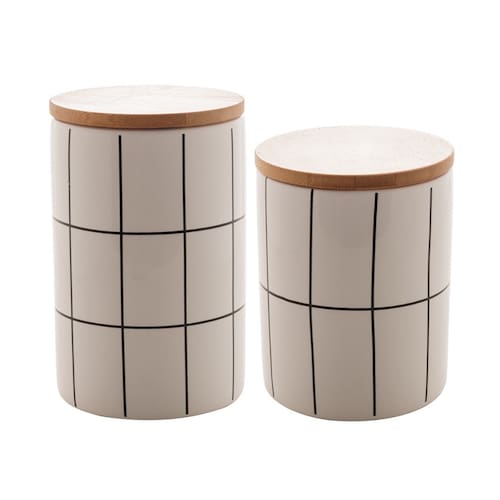 Contém: 1 Potiche de Cerâmica c/Tampa Bambu Branco 10cm x 10cm x 12,5cm + 1 Potiche de Cerâmica c/Tampa Bambu Branco 10cm x 10cm x 15cm Peso: Kg Cor: Branco Material: Cerâmica