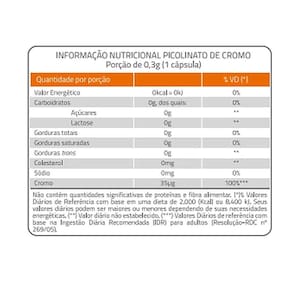1 cápsula ao dia atende a 100% da idr 1 cápsula ao dia Não contém glúten Zero açúcares 0kcal zero valor energético Ingredientes: picolinato de cromo. Antiumectantes: celulose microcristalina ins 460i e dióxido de silício ins 551 e gelificante gelatina ins 428 . não contém glúten.