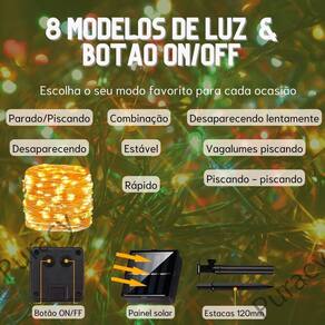 Pisca Pisca Led possui uma placa solar que carrega a bateria durante o dia, e ao anoitecer, ele possui um acionamento automático sem necessidade de ligar manualmente. Não precisa de Tomada, fácil de ser instalado. 100% à prova d'água e possui longa vida útil. 8horas de Funcionamento Com 2 Modos de Iluminação. Fixo ou Pisca-pisca com 8 efeitos Luz Colorida com Amarelo