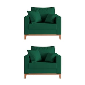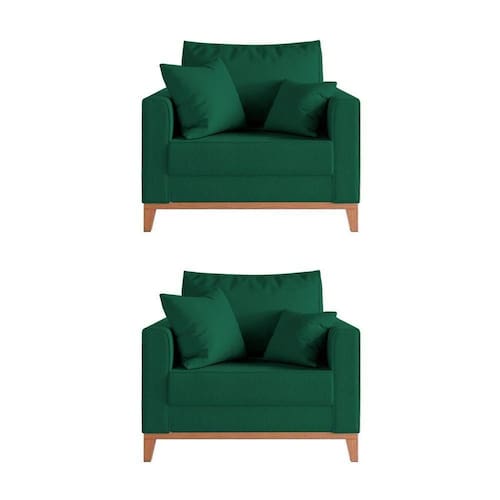 IMAGENS MERAMENTE ILUSTRATIVAS REALIZADO EDIÇÃO, PODENDO HAVER UMA PEQUENA VARIAÇÃO DE COR DEPENDENDO DE CADA TELA OU MONITOR.Kit 2 Poltronas Beny para RecepÃÃo com 2 Almofadas Veludo Verde Base em Madeira MaciÃa