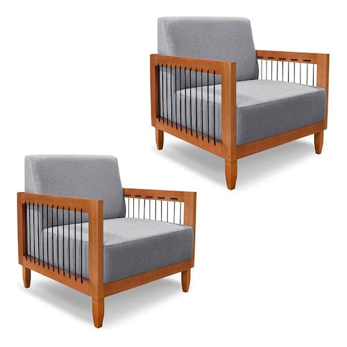 Kit 2 Poltronas Decorativa Marilia Linho Grafite Base em Madeira Castanho - Pallazio