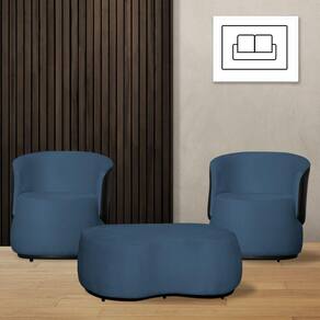 Kit 2 Poltronas Decorativas e 1 Puff Grande Estilo Orgânico Beatriz Suede Composê Corino Preto - Estopar - Azul Royal