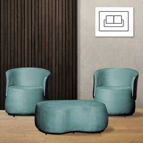 Kit 2 Poltronas e 1 Puff Grande Estilo Orgânico Beatriz Veludo Composê Corino Preto - Estopar - Azul Turquesa