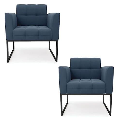 Você gosta de colecionar vários momentos memoráveis com sua família e amigos? Que tal recebê-los, com móveis de altíssima qualidade que só a DRossi tem? O Kit 2 Poltronas Elisa é adequado para você! Seu design retrô é a grande tendência do momento. Pode ser utilizado em diversos espaços da casa, em salas, hall de entrada, quartos, cozinhas, varanda, sacada, escritório, dentre outros. Contém as seguintes características: A estrutura é feita de madeira de Eucalipto 100% de reflorestamento, e a Base Industrial Metálica Preto, além de ser resistente e durável, suporta em média até 120 kg. Assento, encosto e braços, contém enchimento de espuma D-23 e é estofada em tecido Suede, no tom Azul Marinho, que oferece muito conforto e resistência ao sentar, com aquela sensação de maciez e aconchego. Possui também, detalhes de costura no encosto e assento, resultando em um acabamento impecável, conferindo muito mais valor e elegância ao seu espaço. Para complementar a decoração com essas lindas poltronas, a dica é utilizar mantas, almofadas ou vasinho de flor. E pronto, seu cantinho estará perfeito para descansar e relaxar! Aqui, você encontra várias opções, para que seus amigos e familiares se sintam acolhidos. Garanta já seu Kit 2 Poltronas.
