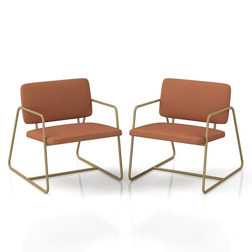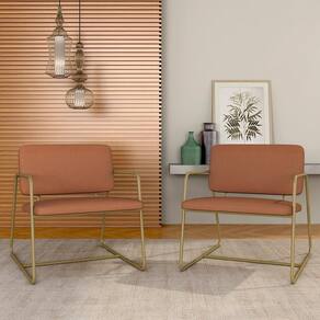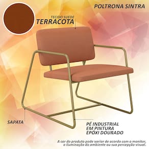 Detalhes Técnicos das Poltronas - Assento e Encosto Tapeçados, Estofados e Fixos - Espuma do Assento e do Encosto: D20 - Tonalidade: Dourado/Suede Terracota - Material: Metalon - Medida Poltrona: A: 75CM x L: 68CM x P: 85CM - Medida do chão até o assento: 45cm de altura - Poltrona suporta até 120KG - Montagem: Difícil
